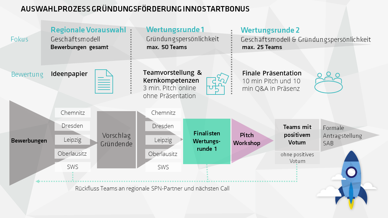 Die Umsetzung der regionalen Vorauswahl und der ersten Wertungsrunde (WR 1) erfolgt von fünf regionalen Teilgruppen des Gremiums sachsenweit in Chemnitz, Dresden, Leipzig, Oberlausitz und Südwestsachsen. Diese bewerten zunächst unabhängig voneinander ausschließlich die online eingereichten Ideenpapiere mit Fokus auf die vorgegebenen Kriterien der Richtlinie. Nach der Zusammenführung der Bewertungsergebnisse, legen die Teilgruppen die Einzel- bzw. Teamgründenden fest, die sich in WR1 am 31. Mai mit einem dreiminütigen Elevatorpitch vorstellen. Im Ergebnis stehen sachsenweit rund 25 Bewerbungen in der zweiten Wertungsrunde (WR 2). Im Rahmen eines zehnminütigen Pitchs am 29. bzw. 30. Juni 2022 präsentieren diese ihre Idee und stellen sich den Fragen des Gremiums.
