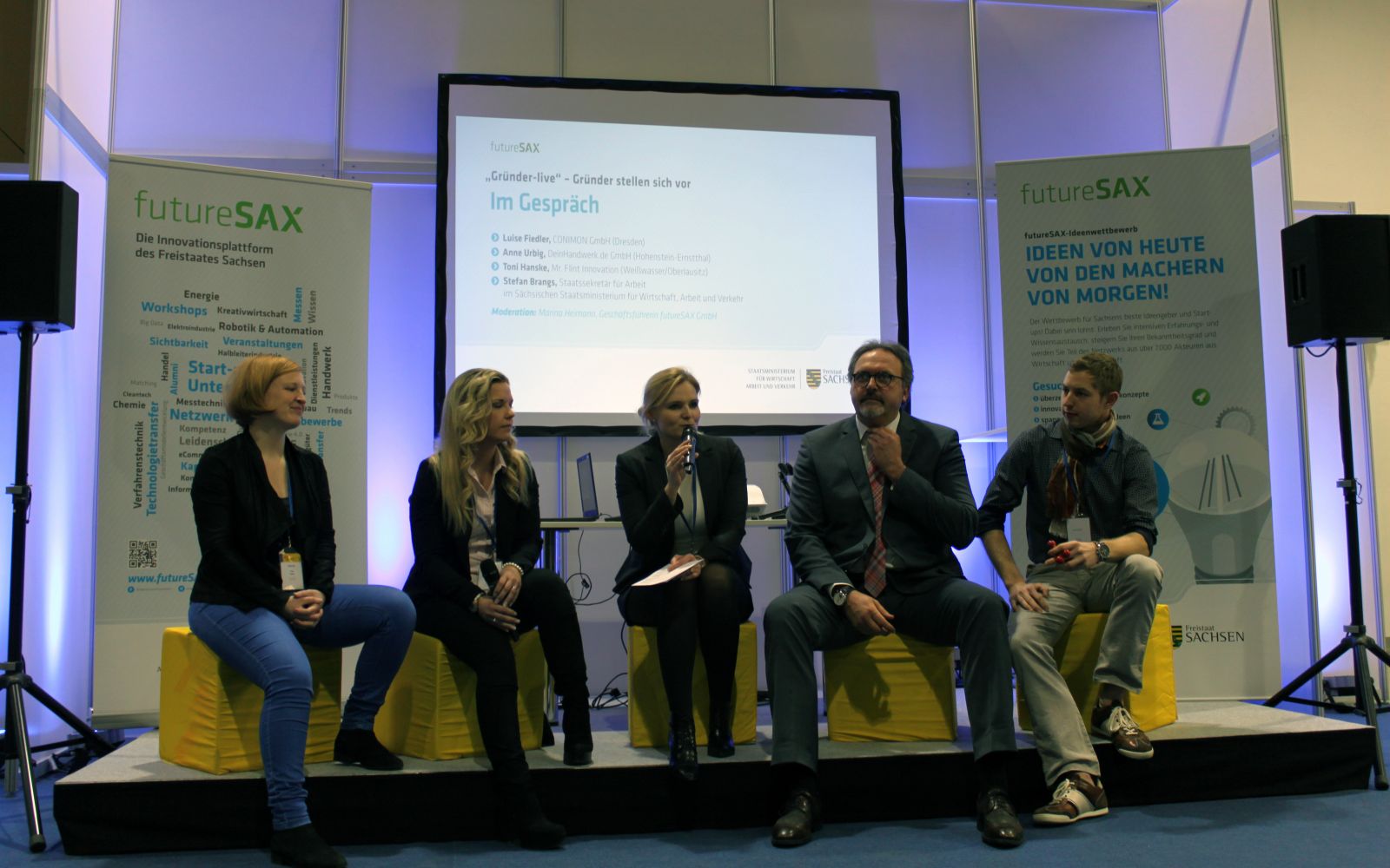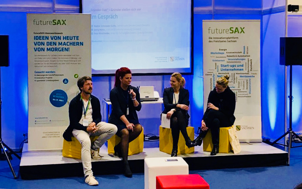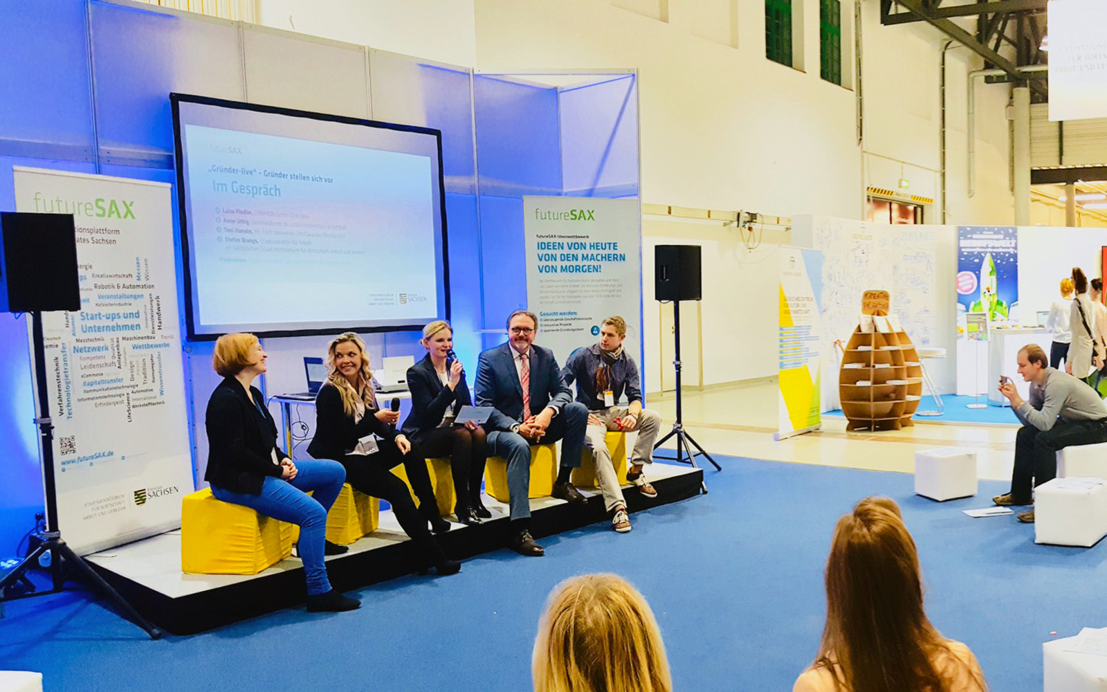 Doch auch im Anschluss ging es direkt mit einem Highlight weiter. Beim Messeformat „Gründer live“ stellten sich einige Start-ups aus dem futureSAX-Netzwerk den Fragen von Marina Heimanns und dem Publikum und erzählten, wie ihre Gründungsgeschichte verlaufen ist und sich aktuell entwickelt. Als besonderes Highlight besuchte dabei Stefan Brangs, der Staatssekretär für Arbeit im Sächsischen Staatsministerium für Wirtschaft, Arbeit und Verkehr am Samstag das Format und stand den Gründern und futureSAX Rede und Antwort.