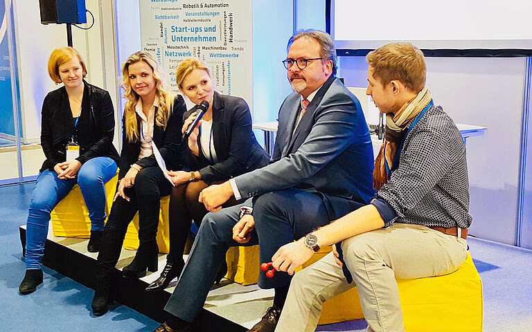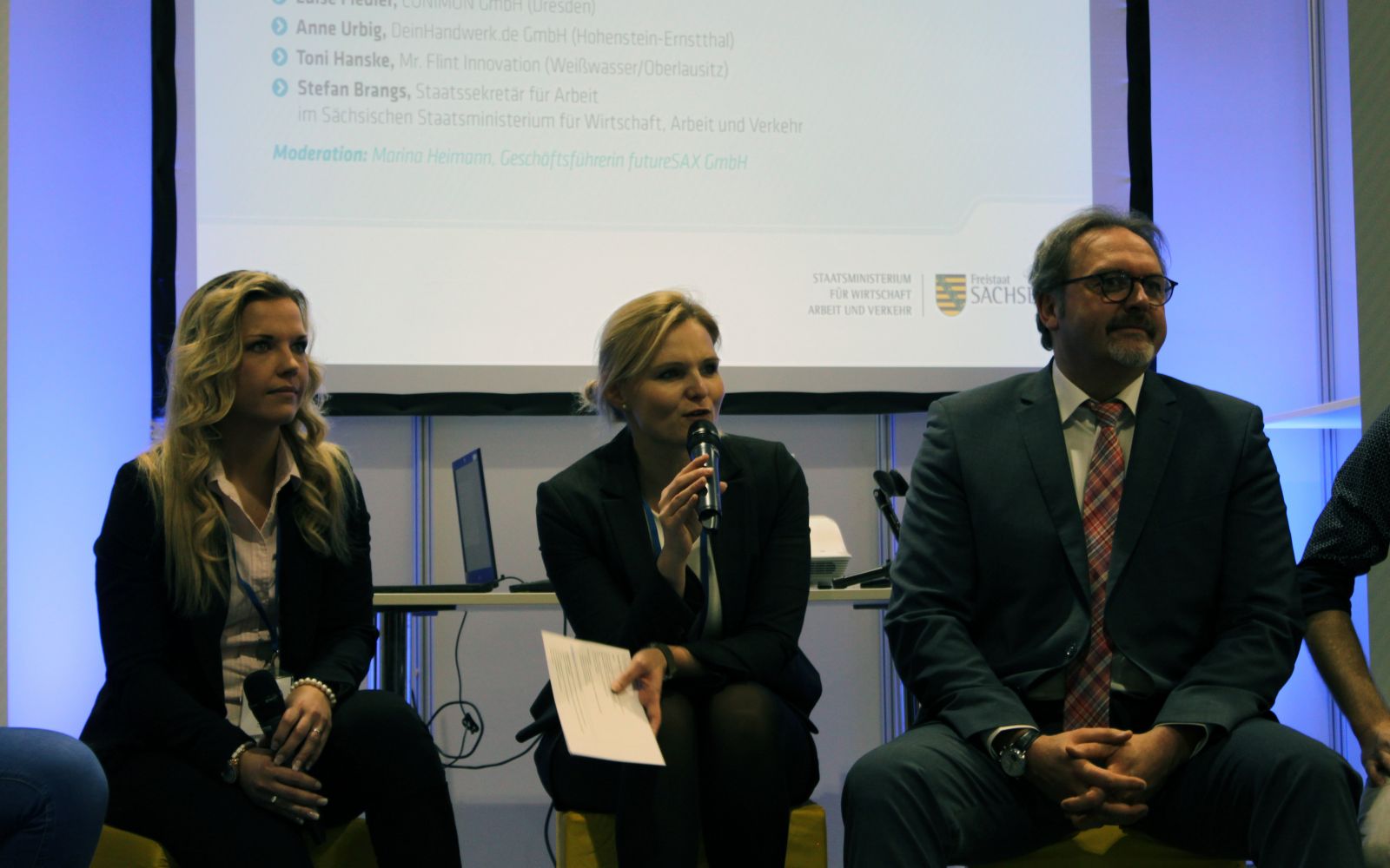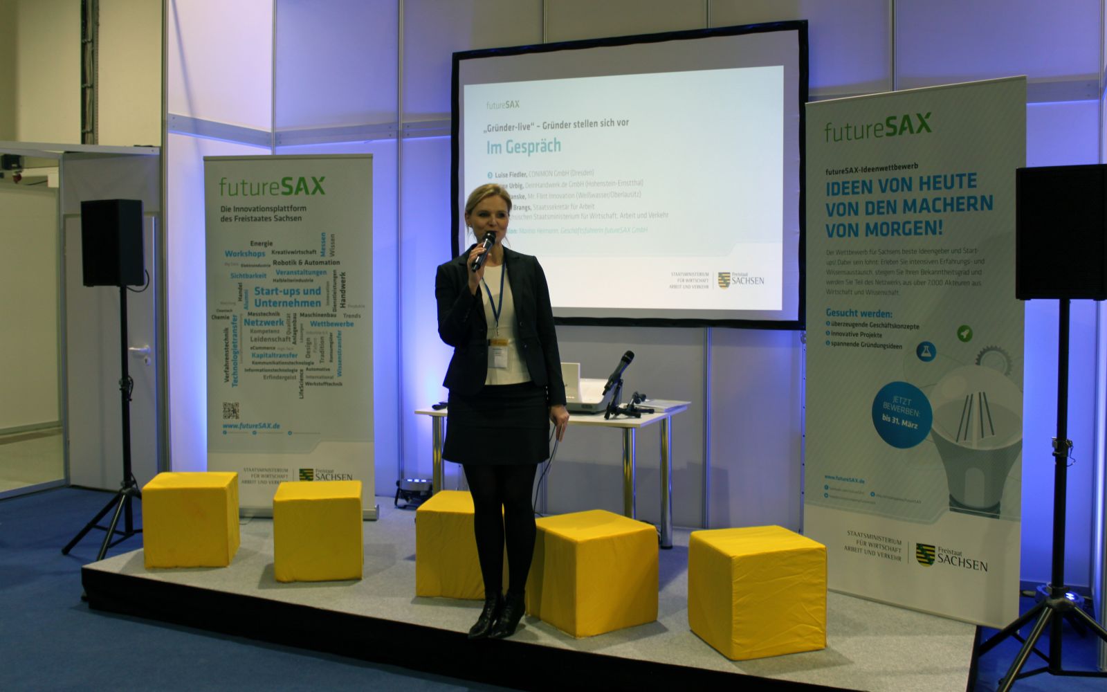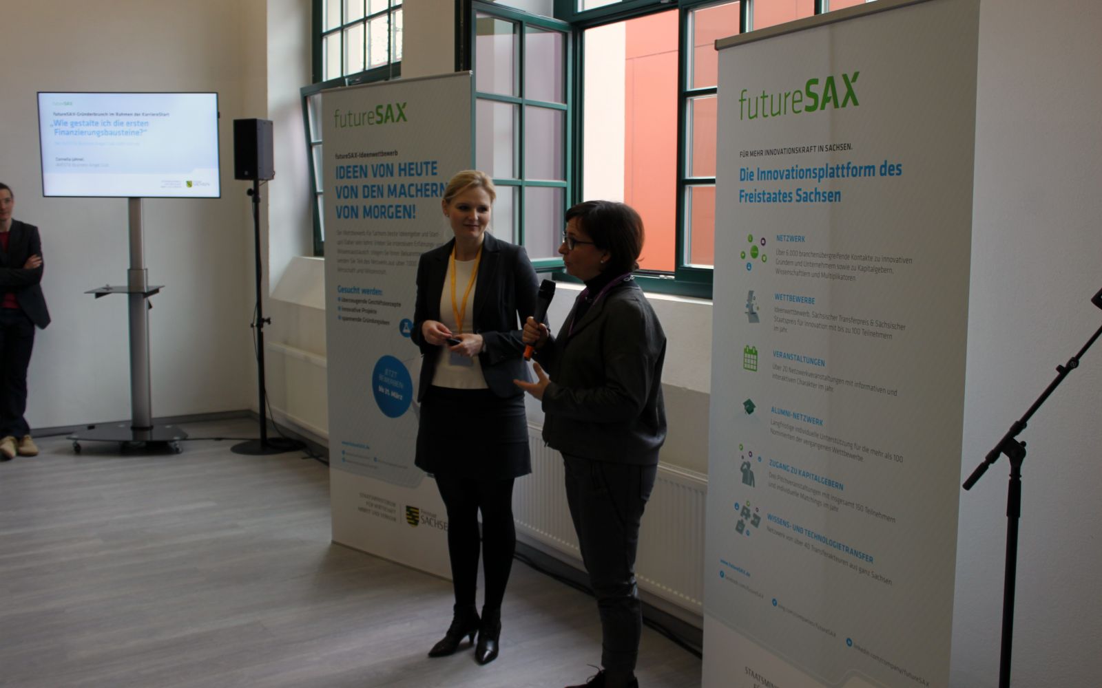 Doch auch im Anschluss ging es direkt mit einem Highlight weiter. Beim Messeformat „Gründer live“ stellten sich einige Start-ups aus dem futureSAX-Netzwerk den Fragen von Marina Heimanns und dem Publikum und erzählten, wie ihre Gründungsgeschichte verlaufen ist und sich aktuell entwickelt. Als besonderes Highlight besuchte dabei Stefan Brangs, der Staatssekretär für Arbeit im Sächsischen Staatsministerium für Wirtschaft, Arbeit und Verkehr am Samstag das Format und stand den Gründern und futureSAX Rede und Antwort.