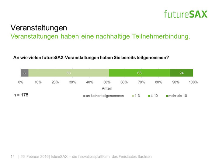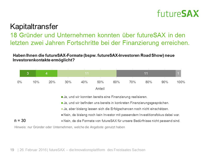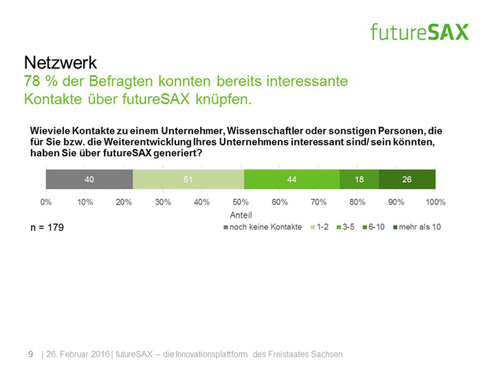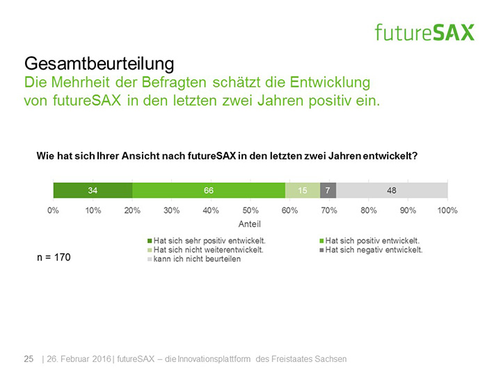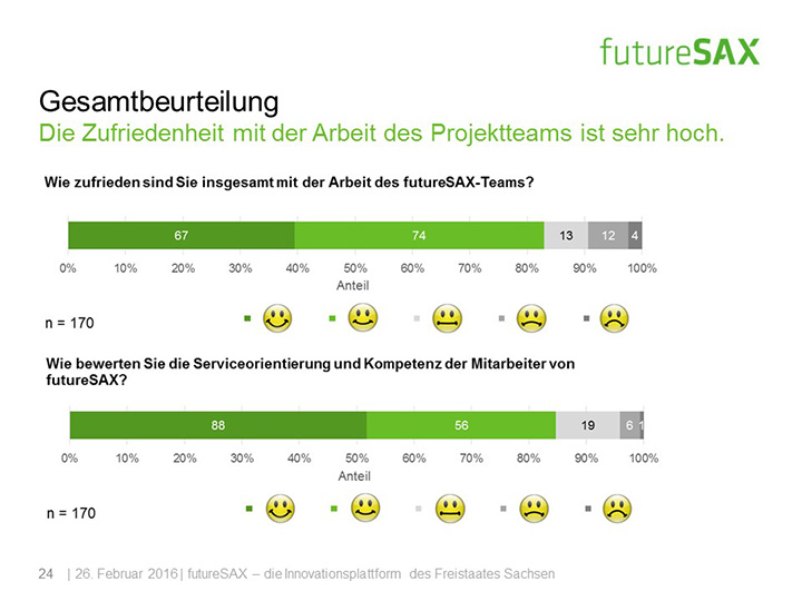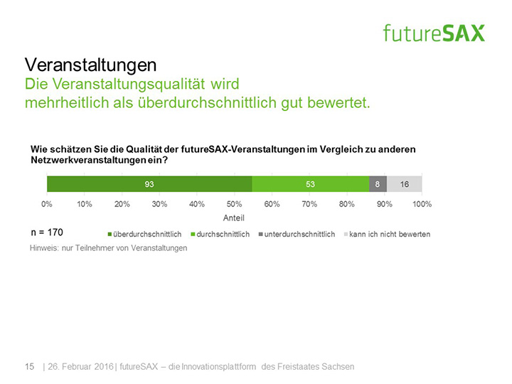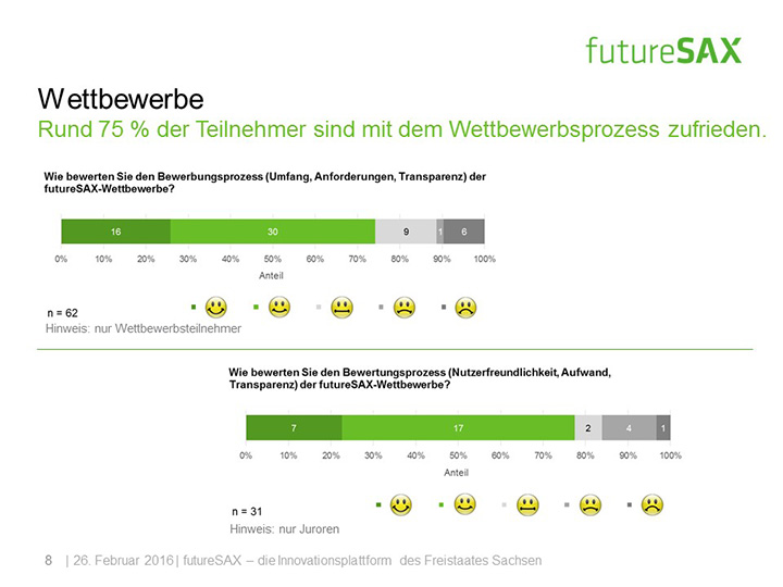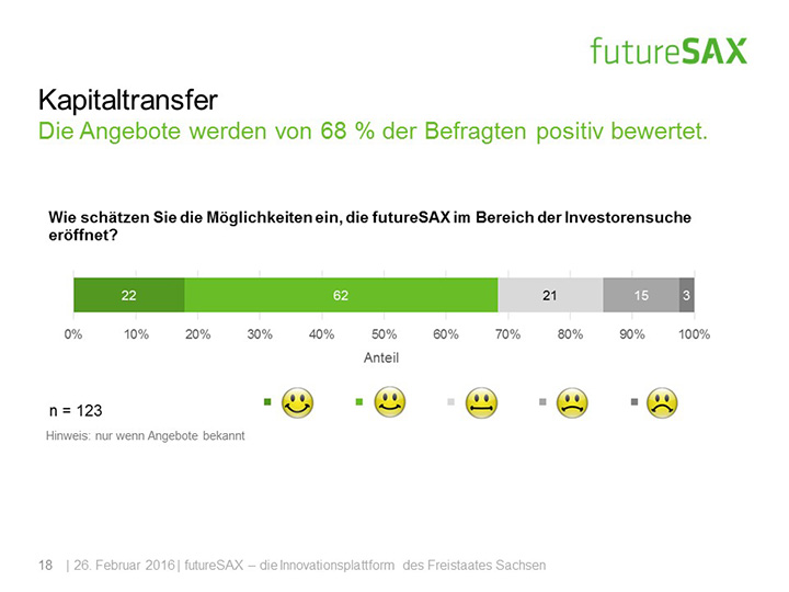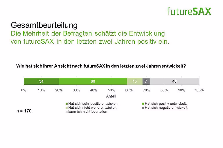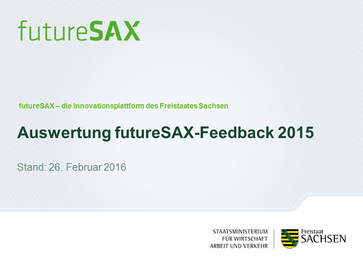 So schätzt die Mehrheit der Befragten die Entwicklung von futureSAX in den letzten zwei Jahren positiv ein. Insbesondere die Veranstaltungen, die branchenübergreifenden Netzwerk-Aktivitäten sowie die Wettbewerbe, wie der futureSAX-Ideenwettbewerb, verstehen und schätzen die Befragten als Kernkompetenzen der Innovationsplattform. Auch die zusätzlichen Transfer-Angebote in den Bereichen Wissen, Technologie sowie Kapital stufen vier von fünf Befragten als relevant ein. Die Umfrage konstatiert außerdem eine hohe Zufriedenheit mit dem Projektmanagement.