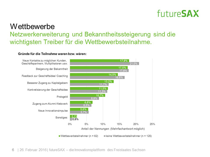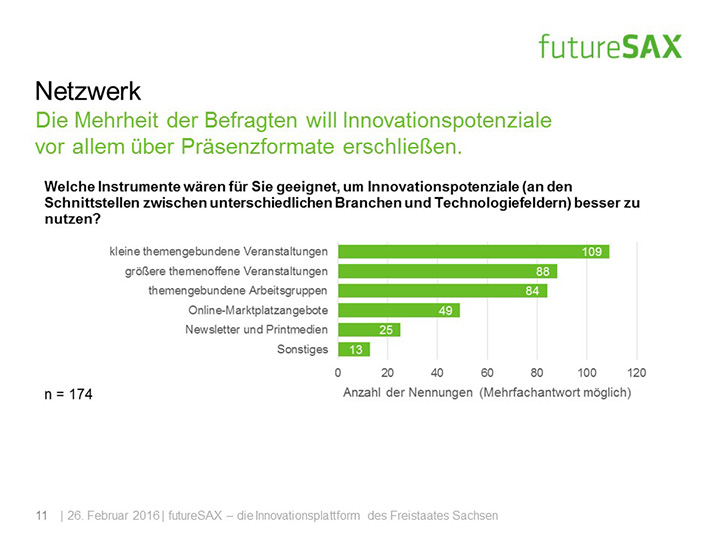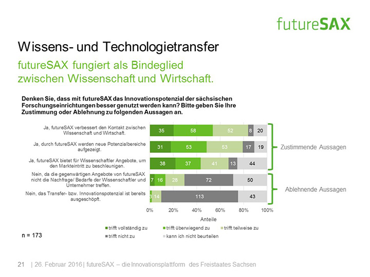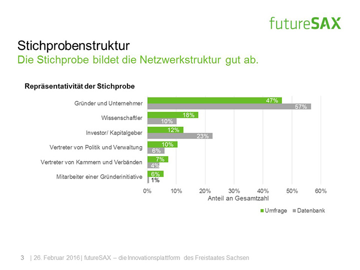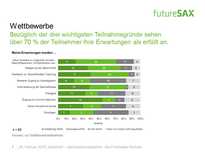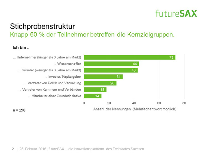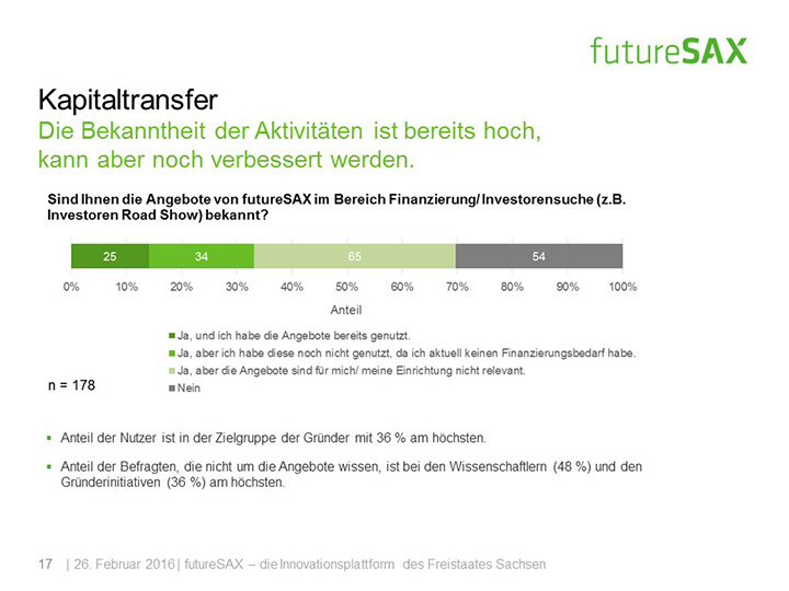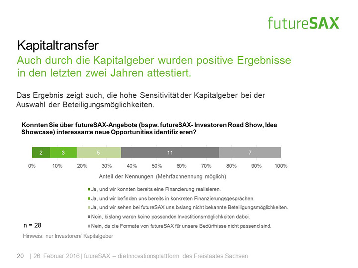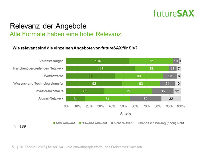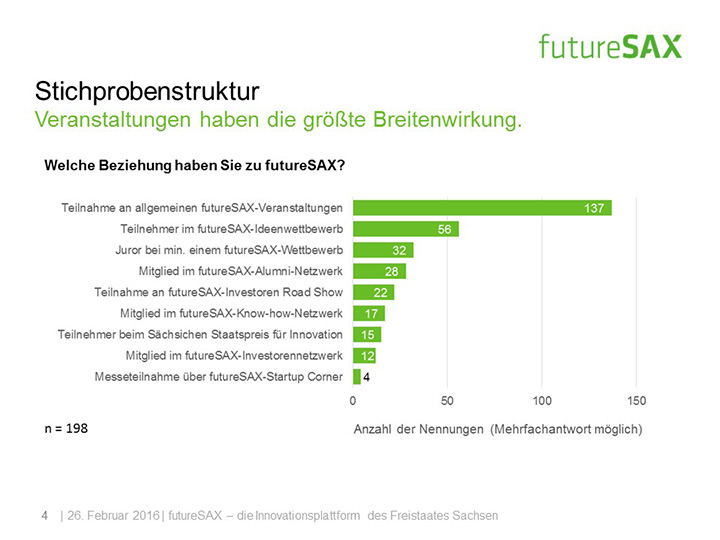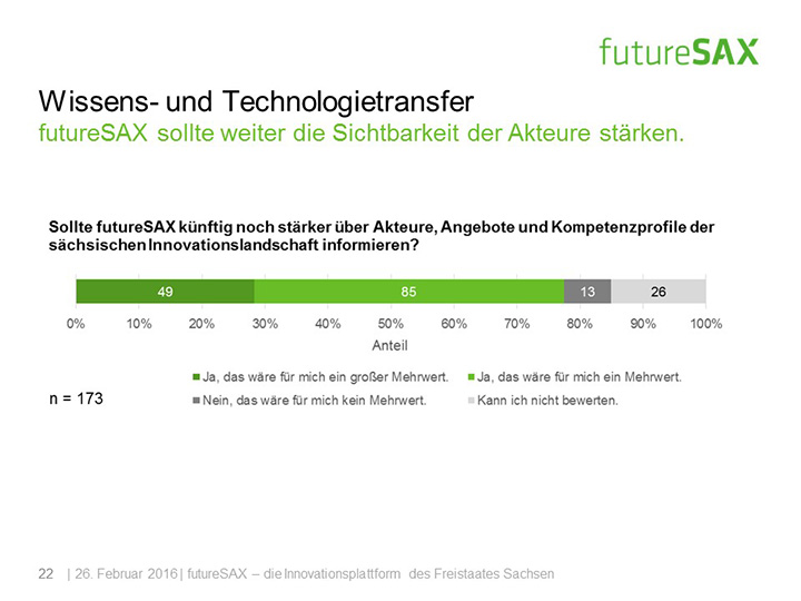 So schätzt die Mehrheit der Befragten die Entwicklung von futureSAX in den letzten zwei Jahren positiv ein. Insbesondere die Veranstaltungen, die branchenübergreifenden Netzwerk-Aktivitäten sowie die Wettbewerbe, wie der futureSAX-Ideenwettbewerb, verstehen und schätzen die Befragten als Kernkompetenzen der Innovationsplattform. Auch die zusätzlichen Transfer-Angebote in den Bereichen Wissen, Technologie sowie Kapital stufen vier von fünf Befragten als relevant ein. Die Umfrage konstatiert außerdem eine hohe Zufriedenheit mit dem Projektmanagement.