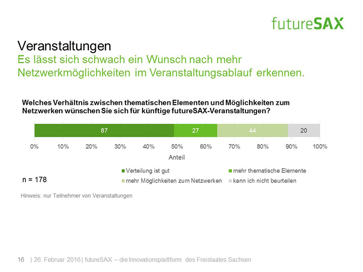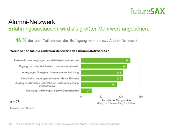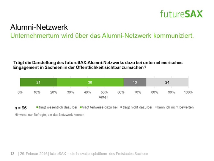 Die Umfrageteilnehmer bewerten die Veranstaltungsqualität mehrheitlich als überdurchschnittlich gut. Zur Erschließung individueller Innovationspotenziale werden von der Mehrheit die kleinen themengebundenen Veranstaltungen, wie das futureSAX-Innovationsforum, bevorzugt. Befragte aus dem futureSAX-Alumni-Netzwerk, zu denen alle Nominierten des futureSAX-Ideenwettbewerbs sowie des Sächsischen Staatspreises für Innovation der vergangenen Jahre zählen, profitieren vor allem durch den generations- und branchenübergreifenden Erfahrungsaustausch untereinander. Der Großteil der Befragten bestätigt, dass das futureSAX-Alumni-Netzwerk zur Darstellung des sächsischen Unternehmertums in der Öffentlichkeit beiträgt.