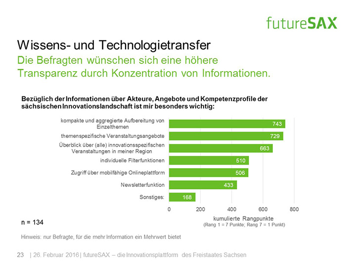 Mehr als drei Viertel der Befragten sprachen sich dafür aus, dass futureSAX auch weiterhin über die Akteure, Angebote und Kompetenzprofile der sächsischen Innovationslandschaft informieren soll. Gleichzeitig besteht der Wunsch nach einer höheren Transparenz durch Konzentration von Informationen. Dem will futureSAX zeitnah mit Neuentwicklungen auf der eigenen Homepage nachkommen.