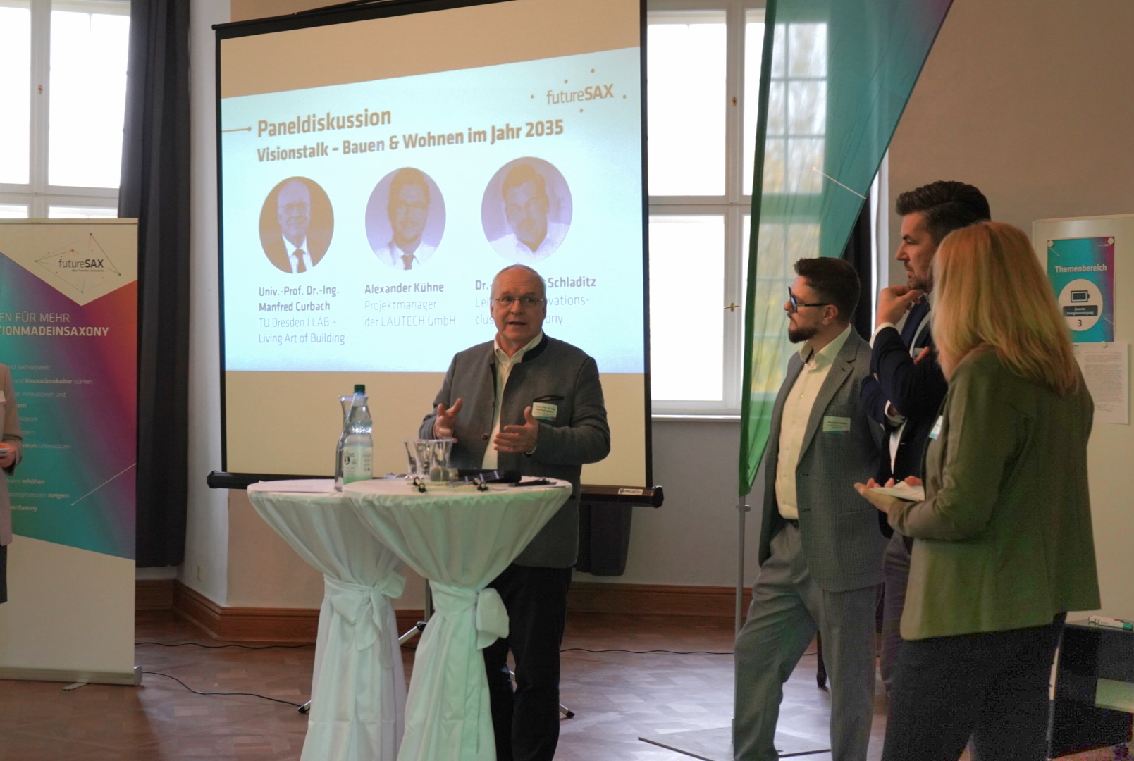 Den Auftakt bildete der Visionstalk „Bauen & Wohnen im Jahr 2035“. Die Panelgäste Prof. Dr.-Ing. Manfred Curbach, ehemaliger Institutsdirektor und Professor am Institut für Massivbau der TU Dresden, Dr.-Ing. Frank Schladitz, Leiter des Innovationsclusters C³-Saxony und Alexander Kühne von der Lausitzer Technologiezentrum GmbH (LAUTECH), diskutierten, wie sich technologische Innovationen, gesellschaftliche Bedürfnisse sowie ökologische und ökonomische Anforderungen zu einem zukunftsfähigen Gesamtkonzept verbinden lassen.