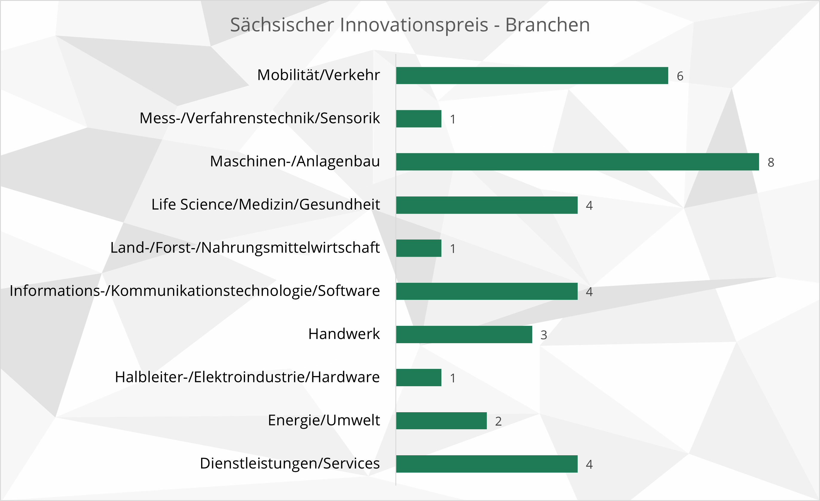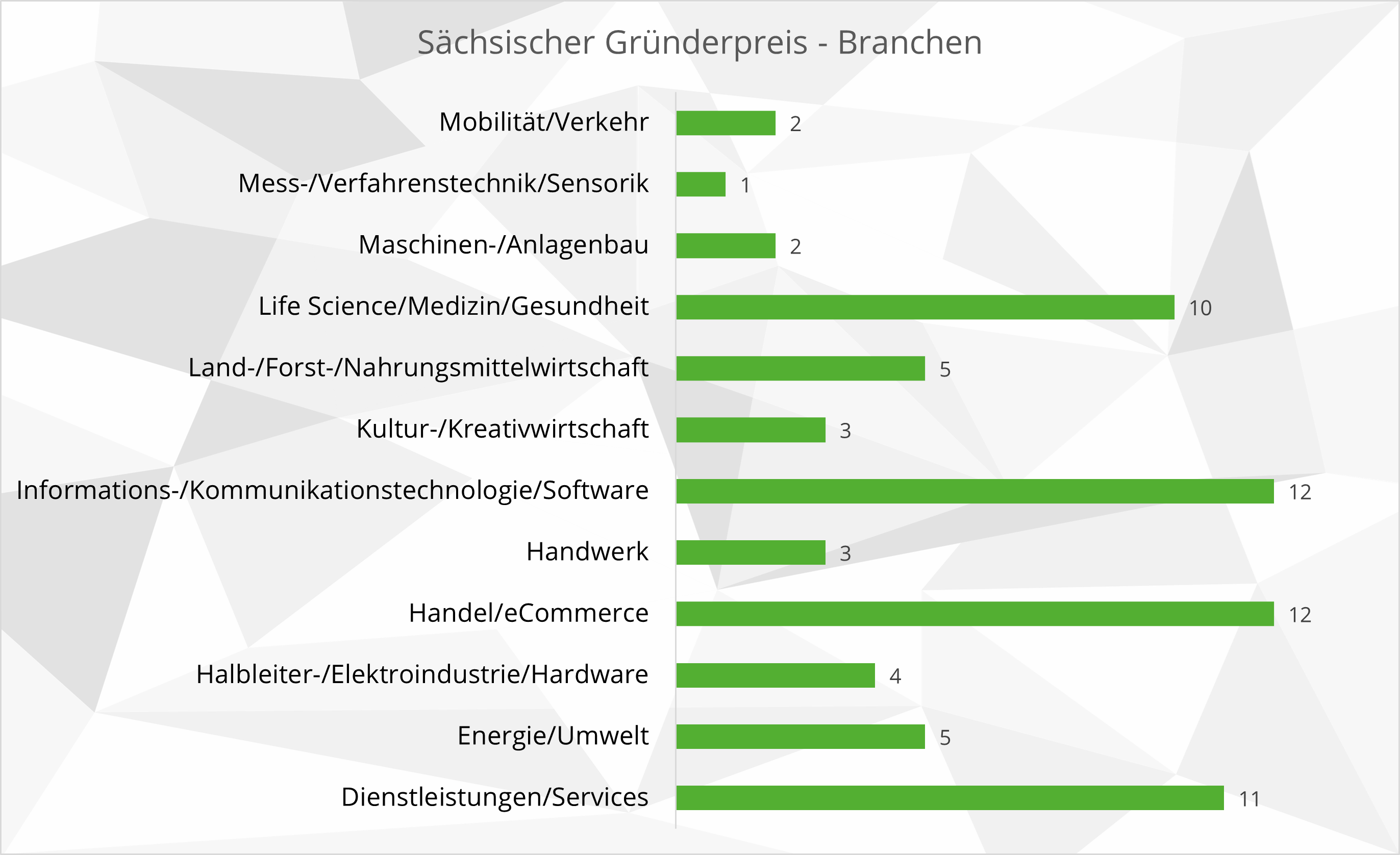 Während der Sächsische Gründerpreis jährlich vergeben wird, finden die Wettbewerbe um den Sächsischen Transferpreis und Sächsischen Innovationspreis aller zwei Jahre statt. Für den Sächsischen Gründerpreis gingen 74 Bewerbungen vornehmlich aus den Großstädten Dresden, Leipzig und Chemnitz (59 Prozent) ein. 13 Branchenbereiche sind vertreten, wobei die meisten Gründungsideen- und -konzepte aus dem Feld der Informations- und Kommunikationstechnologie- bzw. Software-Branche (21 Prozent) stammen. Dies setzt den Trend der vergangenen Jahre in der Gründungsszene fort. Dieses Jahr stammten zudem viele Bewerbungen aus den Bereichen Dienstleistungen und Services (14 Prozent) sowie Life Science, Medizin und Gesundheit (14 Prozent).