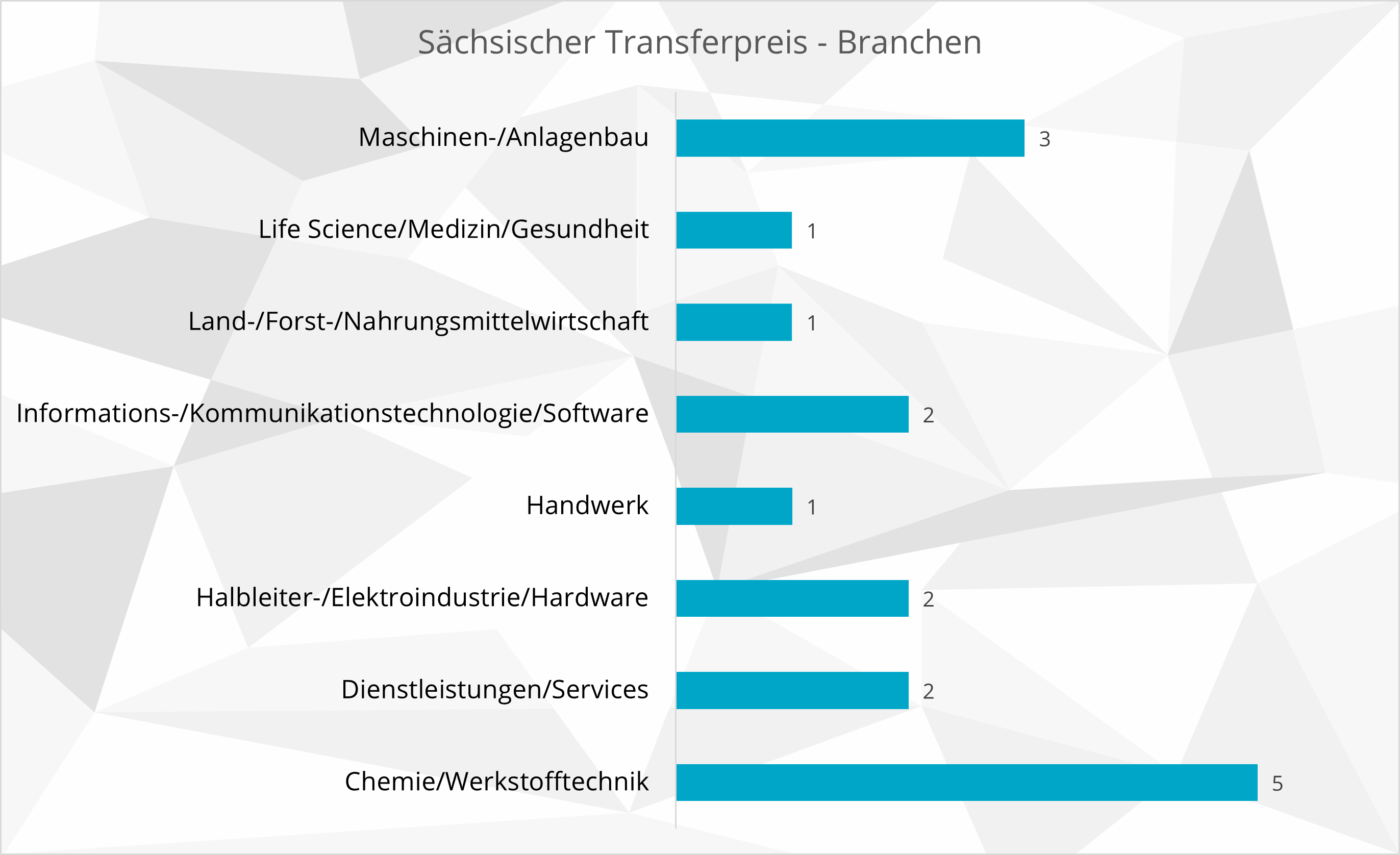 Für den Sächsischen Transferpreis wurden 17 Wissens- und Technologiegebende, die in besonderer Weise zum Gelingen eines Transferprozesses von der Wissenschaft in die Wirtschaft beigetragen haben, aus der sächsischen Wirtschaft vorgeschlagen. Die Einreichungen stammen aus dem Landkreis Mittelsachsen (5), den Städten Dresden (3), Leipzig (3) und Chemnitz (2), dem Erzgebirgskreis (2) sowie dem Landkreis Bautzen (1) und Landkreis Meißen (1). Damit stammen 53 Prozent der Bewerbungen aus dem ländlichen Raum. Hinsichtlich der Transferkanäle mündeten neun Projekte in Aus- bzw. Neugründungen, vier Projekte sind eine Auftrags- oder Verbundforschung, ein Projekt ist ein Weiterbildungsangebot für die Wirtschaft, ein Projekt realisierte seinen Transfererfolg über Personaltausch/Transfer über Köpfe und ein Projekt realisierte den Transfererfolg über Lizenz- oder Patenterwerb bzw. -übertragung. Die Schwerpunkte verteilen sich auf verschiedene Branchenbereiche, wobei in diesem Wettbewerbsverfahren Bewerbungen aus dem Sektor Chemie und Werkstofftechnik überwogen (5).