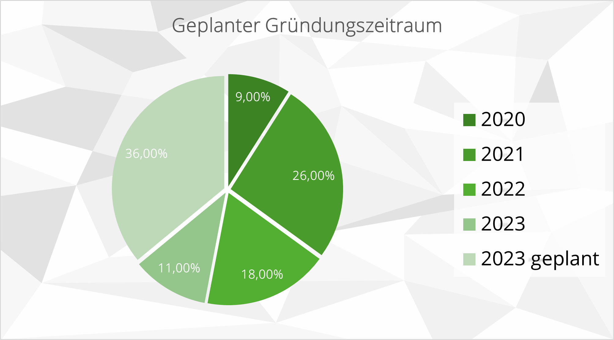 Bei den zugelassenen Gründungen bzw. Gründungsideen befinden sich 36 Prozent in der Vorgründungsphase. Rund 35 Prozent der Bewerbungen wurden 2020 oder 2021, 18 Prozent 2022 und 11 Prozent 2023 gegründet; 27 Teams (36 Prozent) planen die Gründung im Jahr 2023 umzusetzen. 26 der Konzepte (46 Prozent) wurden von Gründerinnen bzw. Teams mit mindestens einem weiblichen Teammitglied eingereicht.