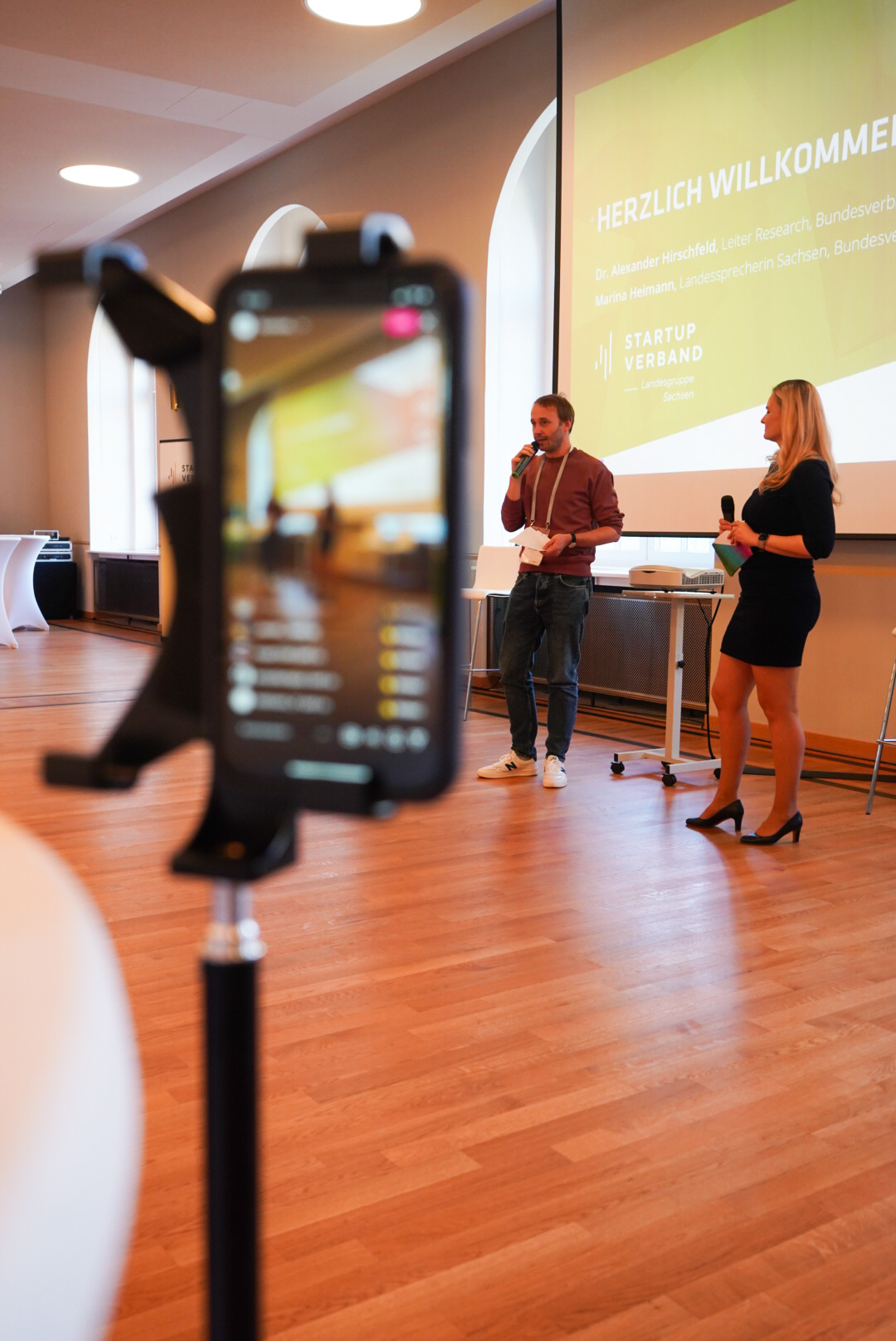 Die phasenübergreifende, gelebte sächsische Gründungskultur des Events zeigte sich zusätzlich in den Slots „Gründungskultur live: Newcomer on stage“, in denen insgesamt vier frühphasige Teams die Möglichkeit hatten, ihre Ideen sichtbar zu machen und wertvolles Feedback zum Pitch aus erster Kapitalgebenden-Hand zu erhalten. Der NextGen-Gründer Hubert Szeja vom Team BRINAX (Meißen) und die durch den InnoStartBonus geförderte Gründerin & Geschäftsführerin Britta Werksnis von Morty's Mysteries (Görlitz), machten den Anfang im Anschluss an die erste Panel-Diskussion. Im zweiten Picht-Slot nutzen Bettina Zimmermann vom Team Munay Alfajores (Dresden) des u.a. mit dresden|exsist verbundenen Accelerators „YETI“ und Deborah Fehr, Gründerin von Crowdrecht (Dresden) und ebenfalls InnoStartBonus-Geförderte, die Gelegenheit und stellten sich und ihre Ideen den Expertinnen und Experten des zweiten Panels.