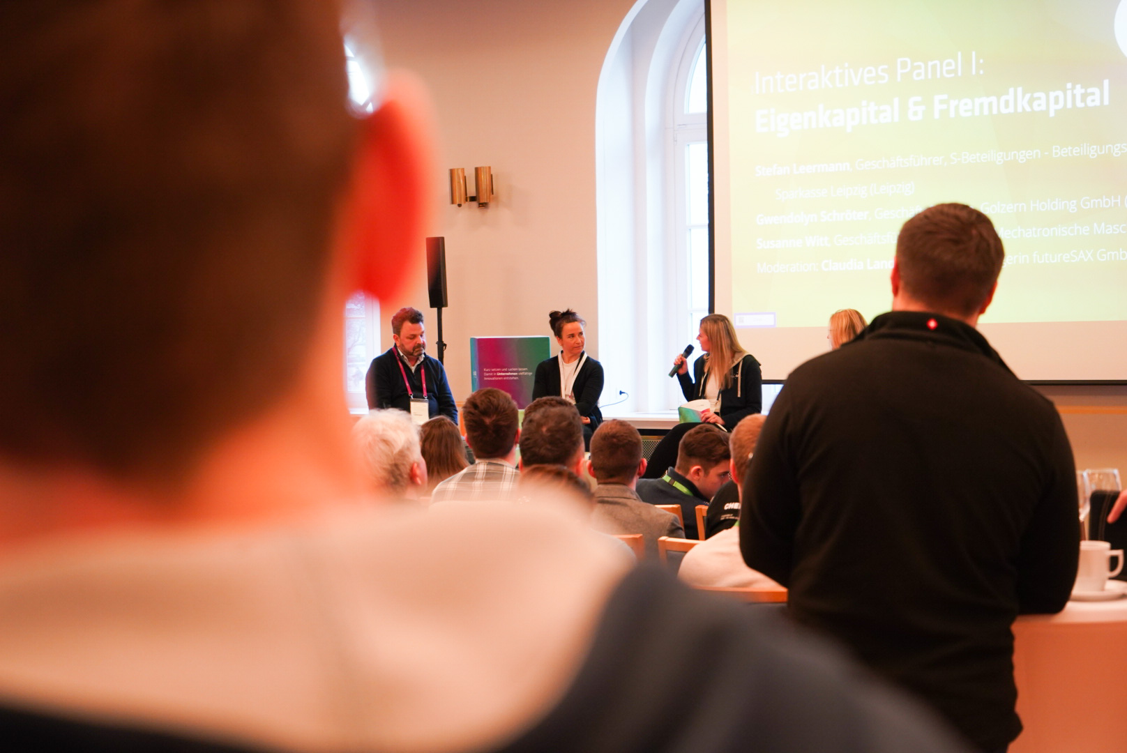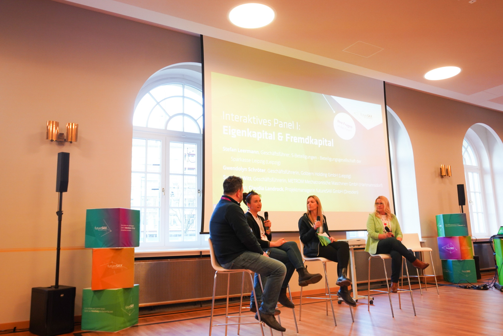 Zwei interaktive Panels hielten zahlreiche Informationen zu den verschiedenen Finanzierungsarten und Platz für individuelle Fragen zum eigenen Finanzierungskonzept bereit. Um Eigen- & Fremdkapital drehte sich dabei das erste Panel, in dem Stefan Leermann, Geschäftsführer bei S-Beteiligungen, der Beteiligungsgesellschaft der Sparkasse Leipzig, Gwendolyn Schröter, Geschäftsführerin der Golzern Holding GmbH (Leipzig) und Susanne Witt, Geschäftsführerin der METROM Mechatronische Maschinen GmbH (Hartmannsdorf), ihre Erfahrungen hinsichtlich erfolgreicher Finanzierungen (Akquise, Process Closing) teilten. Zentrale Learnings aus den Diskussionen waren: