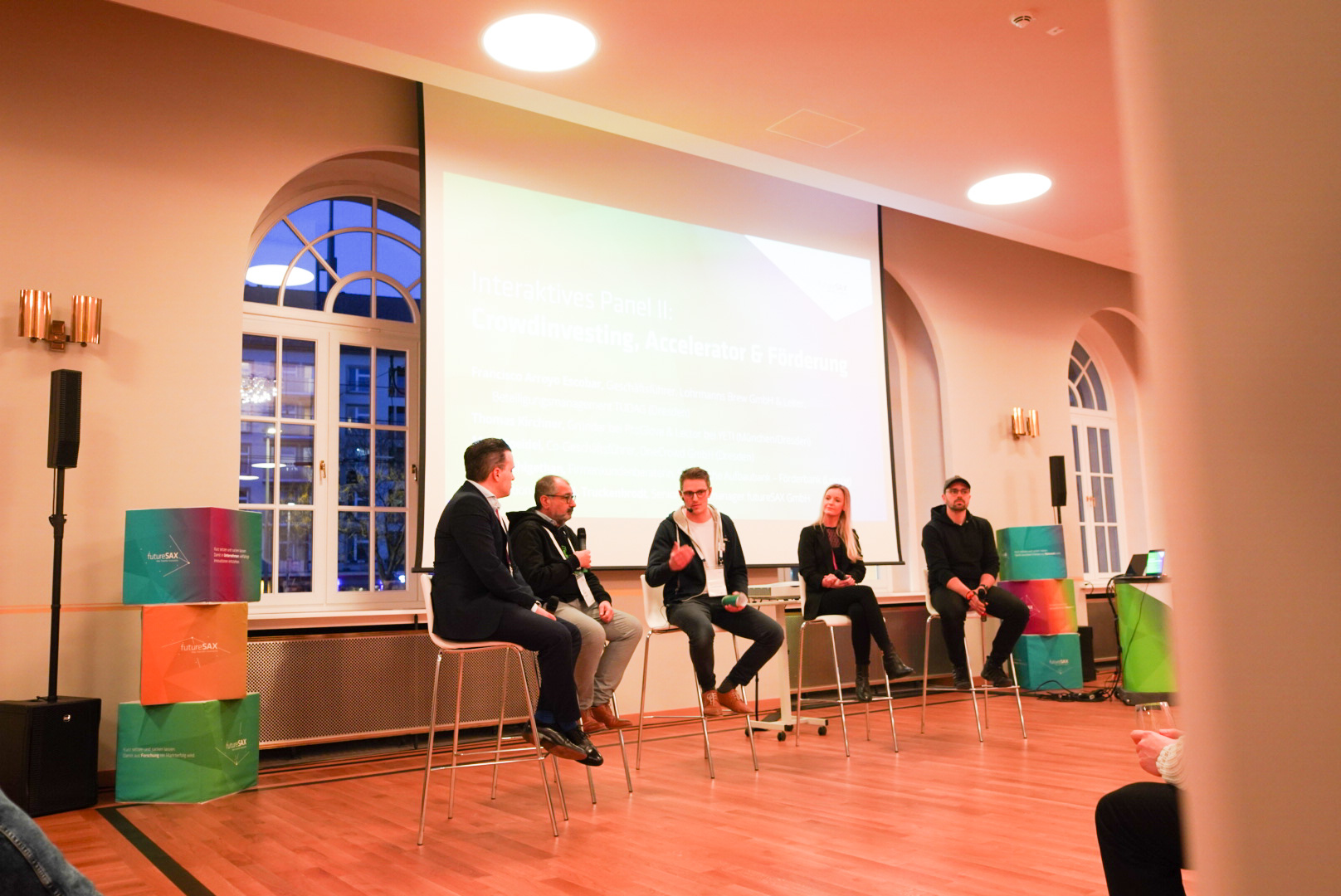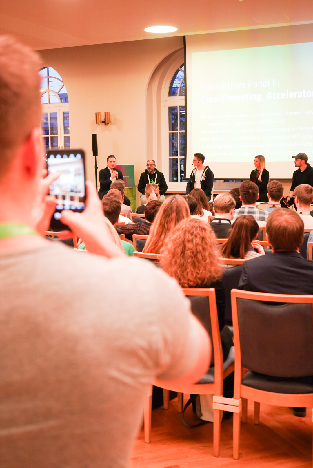 Das weitere interaktive Panel beschäftigte sich mit verschiedenen Formen der Kapitalbeschaffung, besonders im Fokus dabei Crowdinvesting, Acceleratoren und Förderungen. Als Wissens- und Erfahrungsträger/-innen gestalteten Marc Speidel, Co-Geschäftsführer, OneCrowd GmbH (Dresden), Anja Wohlgethan, Firmenkundenberaterin, Sächsische Aufbaubank – Förderbank (Leipzig), Francisco Arroyo Escobar, Geschäftsführer Lohrmanns Brew GmbH & Leiter Beteiligungsmanagement TUDAG (Dresden) und Thomas Kirchner, Gründer der ProGlove GmbH und Lector bei YETI (Dresden) die Session und stellten in der gemeinsamen Diskussion folgende Punkte in den Vordergrund: