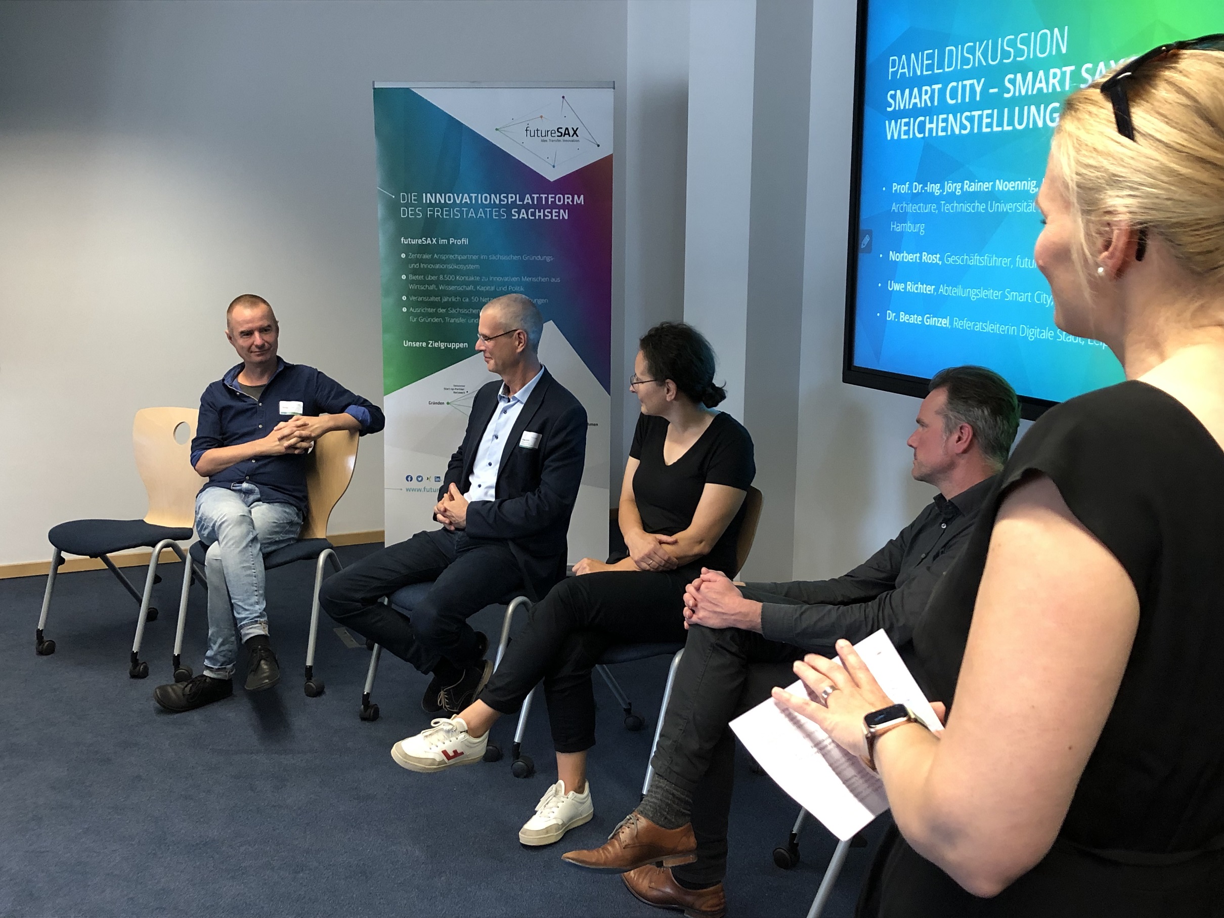 In der anschließenden Paneldiskussion vertieften Dr. Beate Ginzel, Referatsleiterin Digitale Stadt aus Leipzig, Norbert Rost, Geschäftsführer der futureprojects GmbH, Uwe Richter, Abteilungsleiter Smart City der Wirtschaftsförderung der Landeshauptstadt Dresden gemeinsam mit dem Nominierten des Sächsischen Transferpreises 2021 Prof. Jörg Rainer Noennig die Weichenstellung von der Smart City hin zu Smart Saxony. Die Teilnehmenden nutzten die Möglichkeit, Fragen rund um die Themen Smart City, Geschäftsmodellentwicklung und Innovation durch Transfer zu stellen