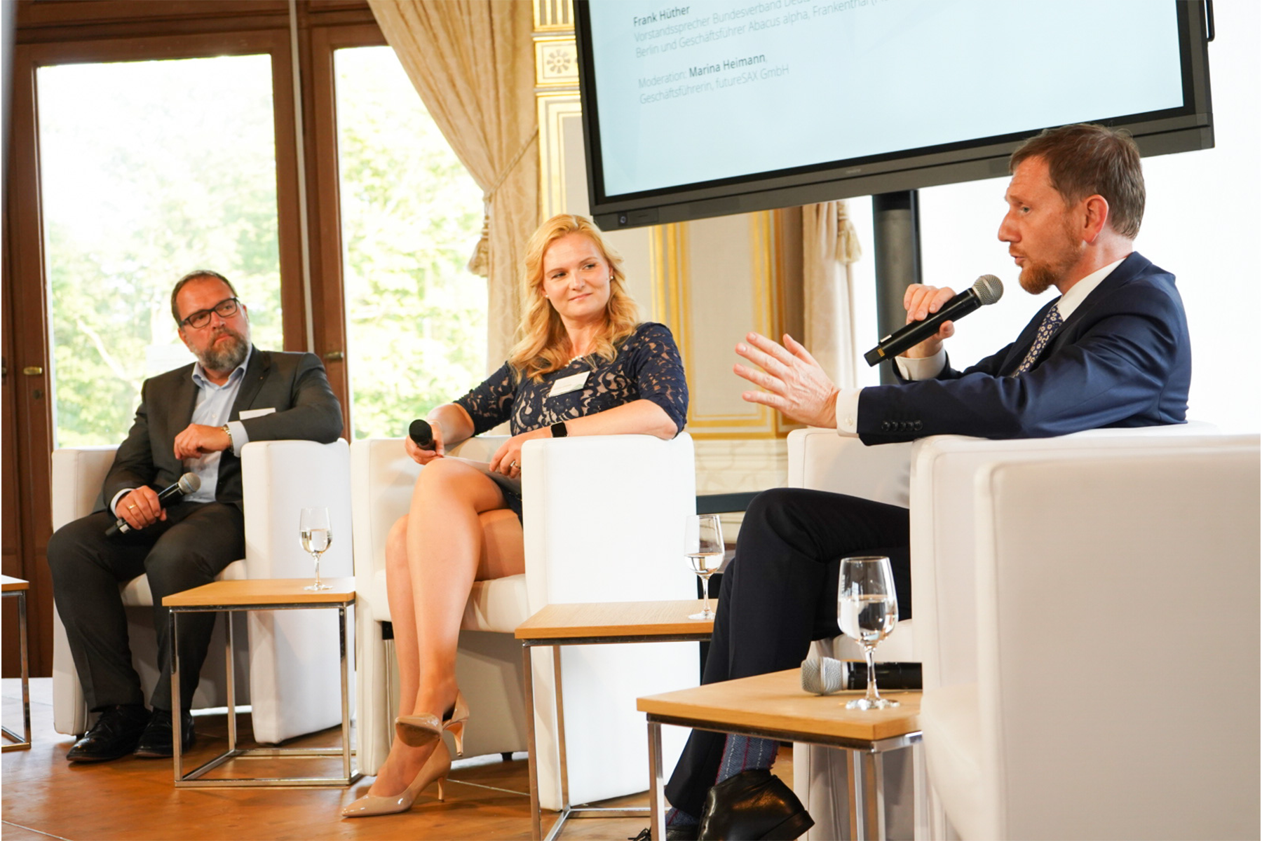 Neben digitalen Innovationen stand auch die starke sächsische Forschungslandschaft im Blickpunkt, vertreten durch die Best-Practice Beispiele Novaled GmbH und Sunfire GmbH. Beide Unternehmen sind schon über 10 Jahre am Markt aktiv und haben sich von Gründungen zu Wachstumsunternehmen mit vielen Mitarbeitern entwickelt. Der von Dr. Katrin Leonhardt, Vorstandsvorsitzende der Sächsischen Aufbaubank – Förderbank – (SAB), moderierte Talk stellte insbesondere die starke Verbindung von Wissenschaft und Wirtschaft heraus. Die Sächsische Aufbaubank – Förderbank – unterstützt Innovationsvorhaben dabei durch diverse Fördermittel und auch direkte Beteiligungen durch die Sächsische Beteiligungsgesellschaft.